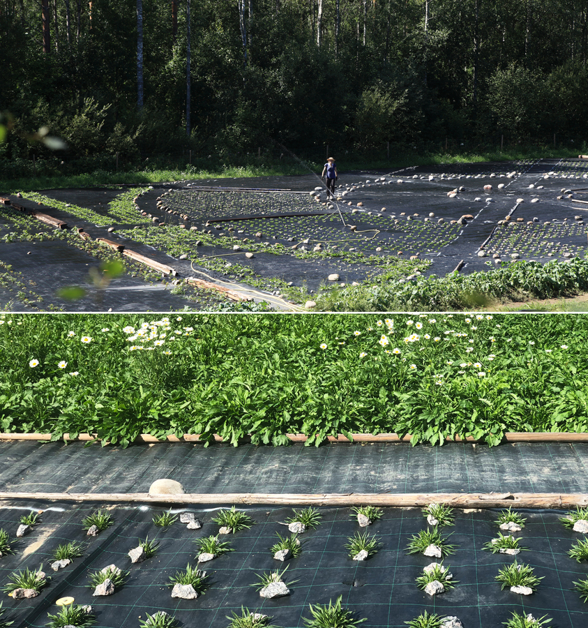 Och tittar man efter så ser man att samtliga 13 olika sorters ängsblommor har tagit sig bra och flera av dem har vuxit sig, relativt sett, rejält kraftiga och blommar för fullt. Det är extra glädjande att se eftersom flera av de närmare 6000 småplantorna som planterades under sommaren verkligen såg små och emliga ut i början. Men med lite stöttning från stenar som höll plasten på plats runt de taniga plantorna så fick de ”en plats i solen”. Lägg därtill en riklig del av det livgivande vattnet ifrån dammen så fann de snart tillvaron i det mystiska plastlandskapet riktigt trivsamt.