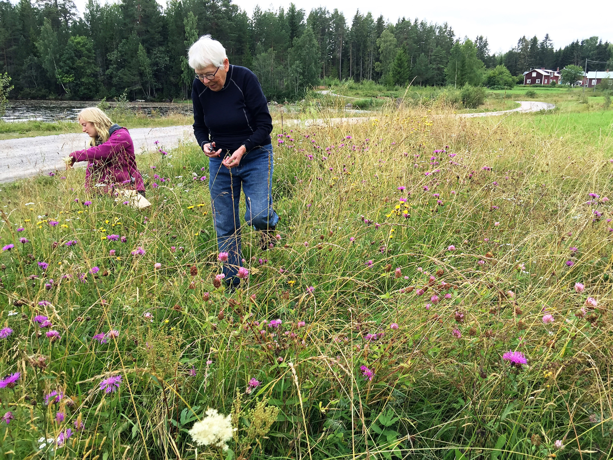 Birgitta Johnsson som har stor kunskap om både trakten och dess flora förstod att om man ska leta sällsynta ängsblommor så behöver man ibland ta sig långt från tät bebyggelse ut till ”vägs ände”. Därför tog hon oss till denna, för många djur och växter, vackra fredade plats. Och naturligtvis hade hon rätt, här finns både ett bestånd av rödklint och ängsvädd som lever i orördhet mellan den klippta dikeskanten och åkern. Markägarna gav genast stöd till idén om att ”spara oasen” med dessa blommor när det för några veckor sedan var dags att slå åkern. Så denna dag samlar vi, med stor tacksamhet till dem, in frön från de små rariteterna med förhoppning om att nästa år kunna odla dem i större skala som ett led i bevarandet av ängsblommor.