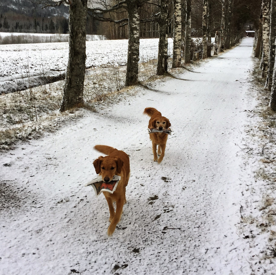 Idag får vitsippsbackarna hjälp av nyfallen snö med att göra landskapet vitt. Candy och Quill gillar läget och är lika villiga som alltid med att ge sig ut och hämta posten.