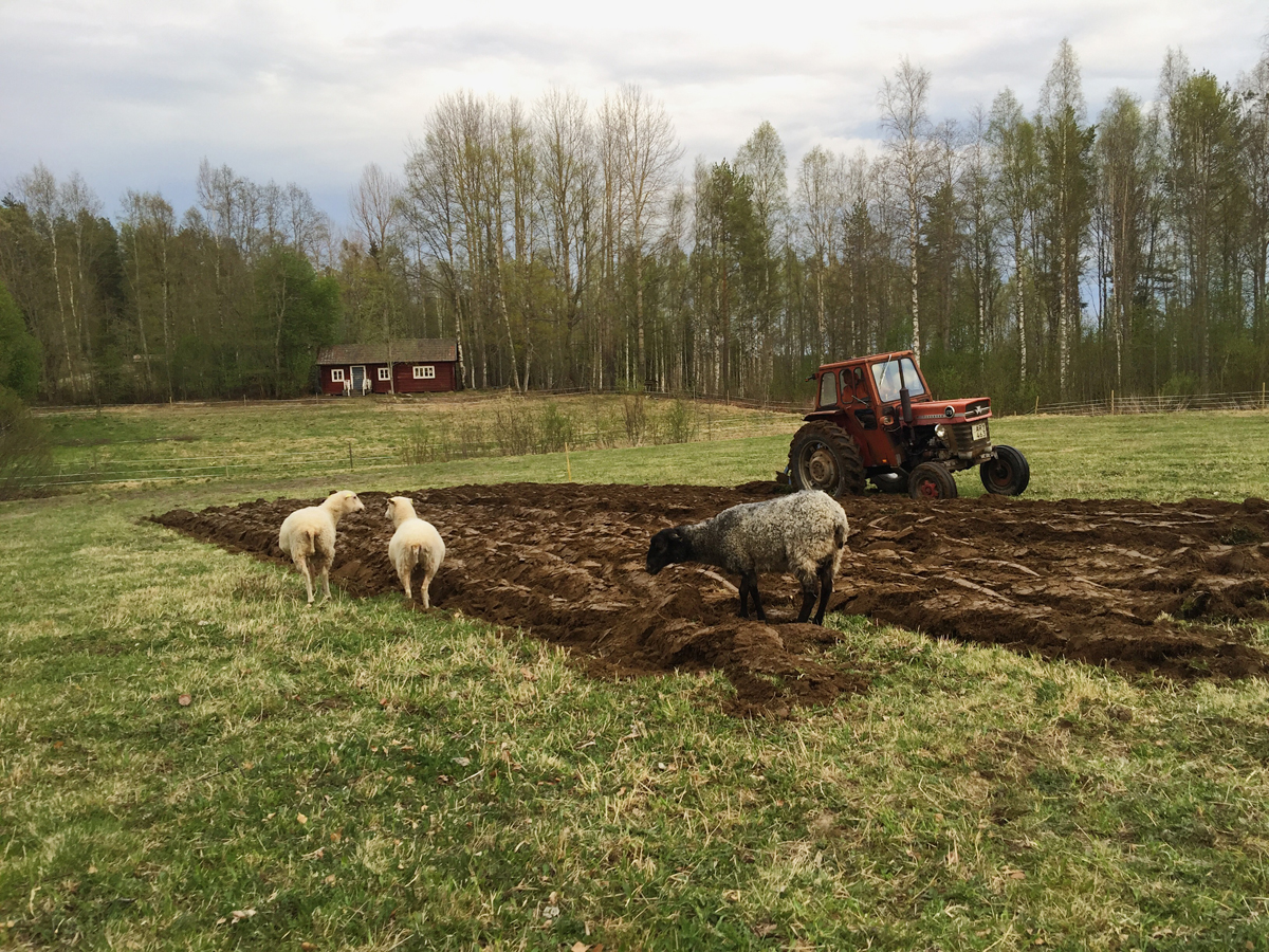Fåren följer plöjningen av den nya potatisåkern med nyfikenhet och viss skepsis. Lätt att förstå att frågorna är många i diskussionen, som verkar pågå mellan Fia-Lisa och Andra, kring den i all hast försvinnande betesmarken.