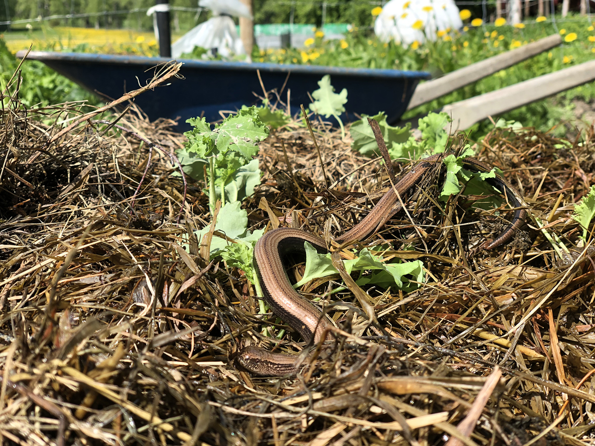 Grodan vi mötte har antagligen lämnat det intilliggande diket för ett besök till köksträdgårdens variationsrika lunchbuffé av maskar, spindlar, sniglar och andra småkryp.