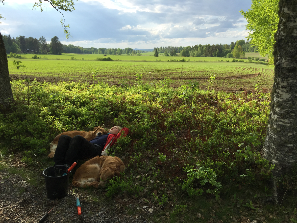 Arbetslaget väntar på att krafterna ska infinna sig igen inför slutspurten av ogräsryckandet i de just nu så lååånga grusgångarna. En stilla undran kring grusgångarnas autenticitet hörs ifrån blåbärsriset, …kan det inte varit så att även gräsgångar haft sina storhetstider på 1700-talet?