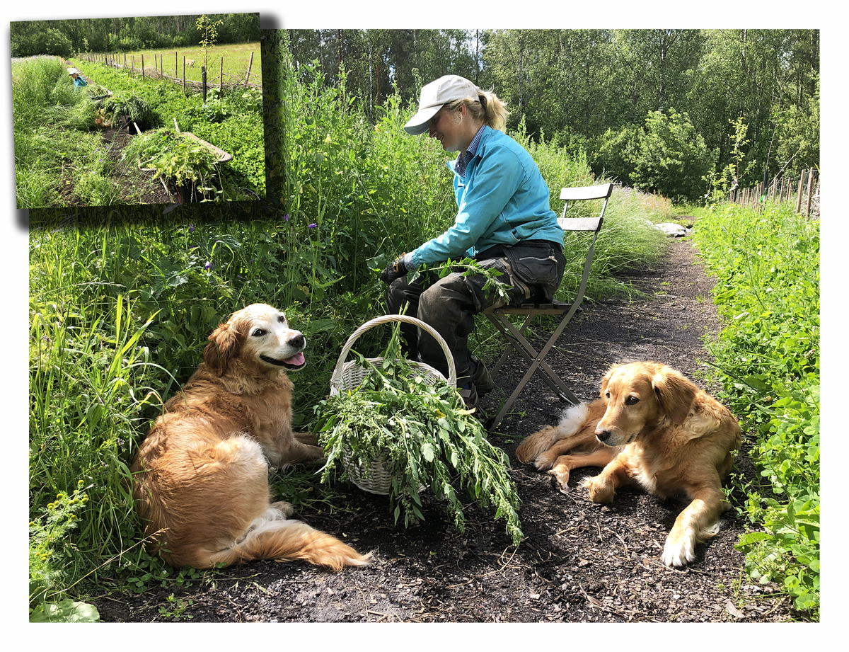 Av åkte skygglapparna och stora källsorteringdagen tog fart. Först åkte ett gäng svinmållor ner i korgen för att tillredas till lunchsoppa åt oss människor. När vi var mätta ersattes korgen med tre skottkärror där svinmålla, nässlor och våtarv hamnade i den första kärran för att torkas till hönsens vinterfoder. Den andra skottkärran fylldes med klippt rajgräs och annan bladmassa för vidare transport till daggmaskarnas buffébord under odlingsbäddarnas hösilagetäcke. Den tredje skottkärran fylldes med rötter, fröställningar odyl för vidare transport till trädgårdskomposten och matförrådet för alla nedbrytare långt bort i hagen. Nu tror och hoppas vi att många Ranbobor firade frigörelsedagen med ett rejält kalas.