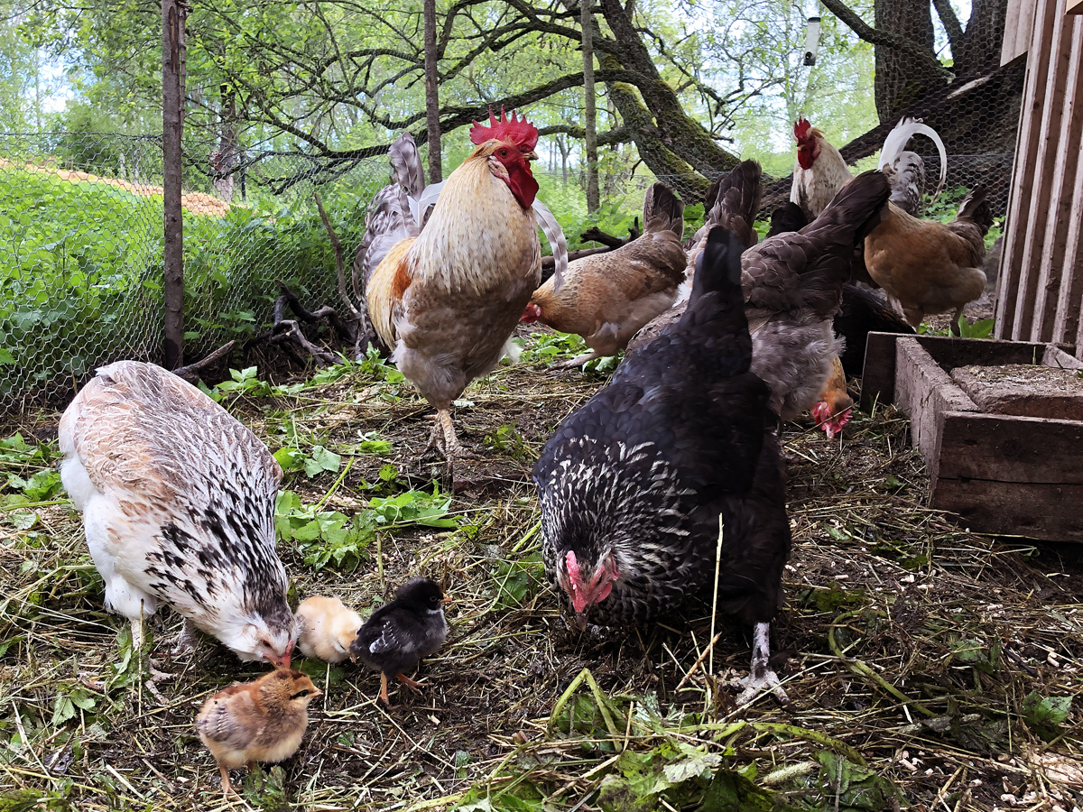 I hönsflocken finns tre hönor som utmärker sig som särdeles bra värphönor. Trots den långa mörka vintern så har det inte gått en dag utan att de tillsammans med sina medsystrar i flocken, och med tupparna som medhjälpare, hittat på nya strategier för att undvika att den där hemska-människan-i-stora-huset kommer och stjäl alla äggen på morgonkvisten. För drygt tre veckor sedan lät vi dem vinna en avgörande seger och de har sedan dess fått ligga kvar på sju av äggen i redet, med resultatet att fyra ulliga små kycklingar häromdagen såg dagens ljus.