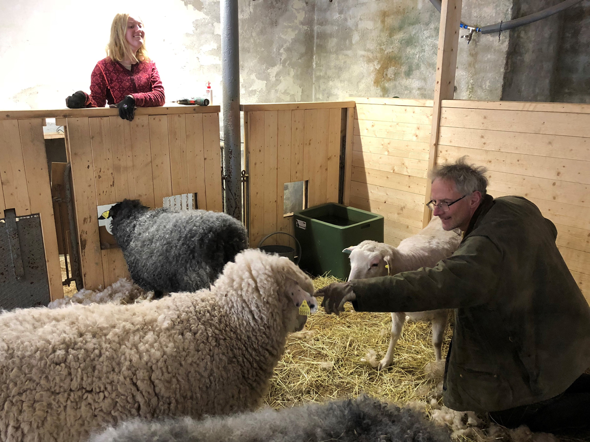 Medan Julia sitter bakom spiltväggen och bjuder fåren, som tittar in genom luckorna, på lite havre, småprat och taktil ansiktsmassage så ser Richard, med fårklippningsmaskinen, till att ”massera” dem på ryggen osv. Ett ovanligt moment, för andra i branschen, är att fånga den viftande ”glada” fårsvansen för att inte råka klippa i den. Likaså att fåren gång på gång köar upp sig vid båset i hopp om att bli ”näste man till rakning” – även de som redan fått sin nya vårfrisyr. Fördelarna med Ranbos fårsalong är många men någon vidare affärsidé är det väl inte – en klippning här tar fortfarande närmare 40 minuter med maskinpaus (Erfarenhet = 4 klippningar) – Det är faktiskt 2 minuter snabbare än Australiske mästaren Ian Elkins behövde för att klippa merinofåret Chris. Nu kanske man bör tillägga att Chris hade rymt och hållit sig undan från klippning i flera år och fick befrias ifrån 40,5 kg ull för att likna ett får igen. Så det kanske är mer rättvist att jämföra vår tid med Nya Zeeländske Rowland Smiths rekord på 45 sekunder… och det var då snittiden på 644 får under ett 8-timmarspass!! Rowlands får viftar förvisso inte på svansen under klippningen men de hinner ju å andra sidan knappt blinka innan det är över så djurrättsorganisationen PETA borde inte kunna invända på varken hans eller vår fårhantering. Det enda plågeriet som de skulle kunna hitta hos oss står fåren i så fall själva för – Varje klippsession avslutas nämligen med att det nyklippta fåret utmanas på stång-match för att undersöka huruvida tidigare rang och styrka bara ”satt i håret” och om flockens rangordning därmed behöver justeras. Här ser vi hur Richard agerar diplomat och försöker distrahera fåret Andra som absolut vill ha ett ”snack” med nyfriserade Fia–Lisa.