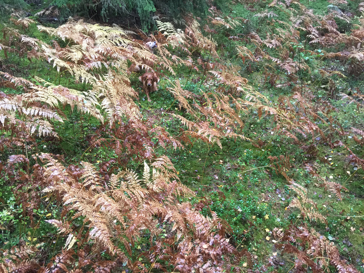Örnbräken på hösten – bra kamouflage för rödbruna hundar (japp, det finns två sådana på bilden). Örnbräken tillhör, tillsammans med flera tusen andra arter, familjen ormbunksväxter (i Sverige finns 35 arter). Under 100 miljoner år i jordens historia så dominerade ”förfäderna” till dessa ormbunkar växtlivet på land. Även i dag har de, speciellt arten örnbräken, en tendens att bli dominanta i områden då den skuggar och kväver andra växter och örnbräken skapar ofta stora problem i många ängs- och naturbetesmarker då den förändrar hela ekosystemet. I Storbritannien har man under de senaste 70 åren arbetet med strategier för att utrota växten, speciellt på utsatta ljunghedar. Den har ett omfattande kemiskt självförsvar och kan orsaka förgiftning, vilket gör den otjänlig som djurfoder. Varifrån kommer då förledet örn… tämligen överraskande kommer det sig av att en ituskuren stjälkbas kan tyckas visa siluetten av en dubbelörn (örn med två huvuden – symbol bl.a för Bysantinska riket – öst- och västrom). Bakgrunden till ordet ”orm” i ormbunke är inte riktigt lika klurigt. Ledtråd: ”Orm” betydde ursprungligen ”mask” – japp, växten användes tidigare som maskmedel.