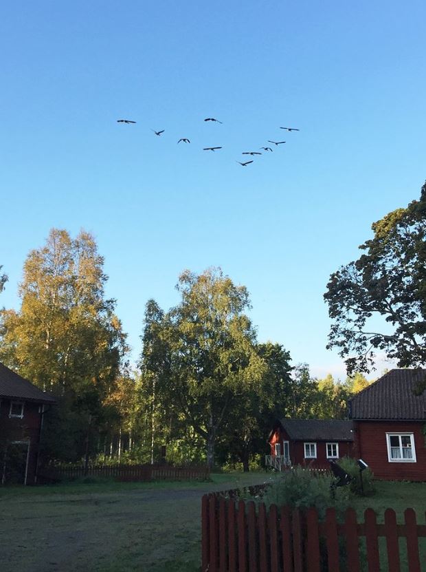 Som ett gigantiskt segertecken avtecknar sig ett V på himlen över Ranbo. Formationen är i dubbel bemärkelse ett slags ”segertåg” för dessa relativt sett stora och tunga fåglar – som tillsammans, på detta vis, kan spara mycket energi under sina förflyttningar, men det är inte av den anledningen, som den seglivade myten uppger, att de som ”tävlingcyklister” lägger sig i ”lä” eller rent av utnyttjar ”drag” eller uppåtströmmar från fågeln framför. Luften bakom de flaxande fåglarna är mycket turbulent, uppåtströmmarna för små och skulle bara bli destabiliserande men genom positioneringen utanför vingspetsen får de ostörd luft, men ändå närhet till fågeln framför. Genom att lägga sig snett utanför varsin vingspets så blir formationen hälften så lång och sikten framåt dessutom fri för samtliga. Bägge dessa bidrar till att det blir lättare att ha uppsikt över flocken och framför allt att snabbt upptäcka och därmed korrigera kursändringar med liten energiförlust och flygningen underlättas därmed avsevärt. Plogformationen är alltså ett sätt för trögmanövrerade fåglar att förflytta sig tätt tillsammans utan att störa varandra snarare än att – såsom tävlingscyklister som cyklar bakom andra – minska luftmotståndet, få ”drag” och spara energi på det sättet.