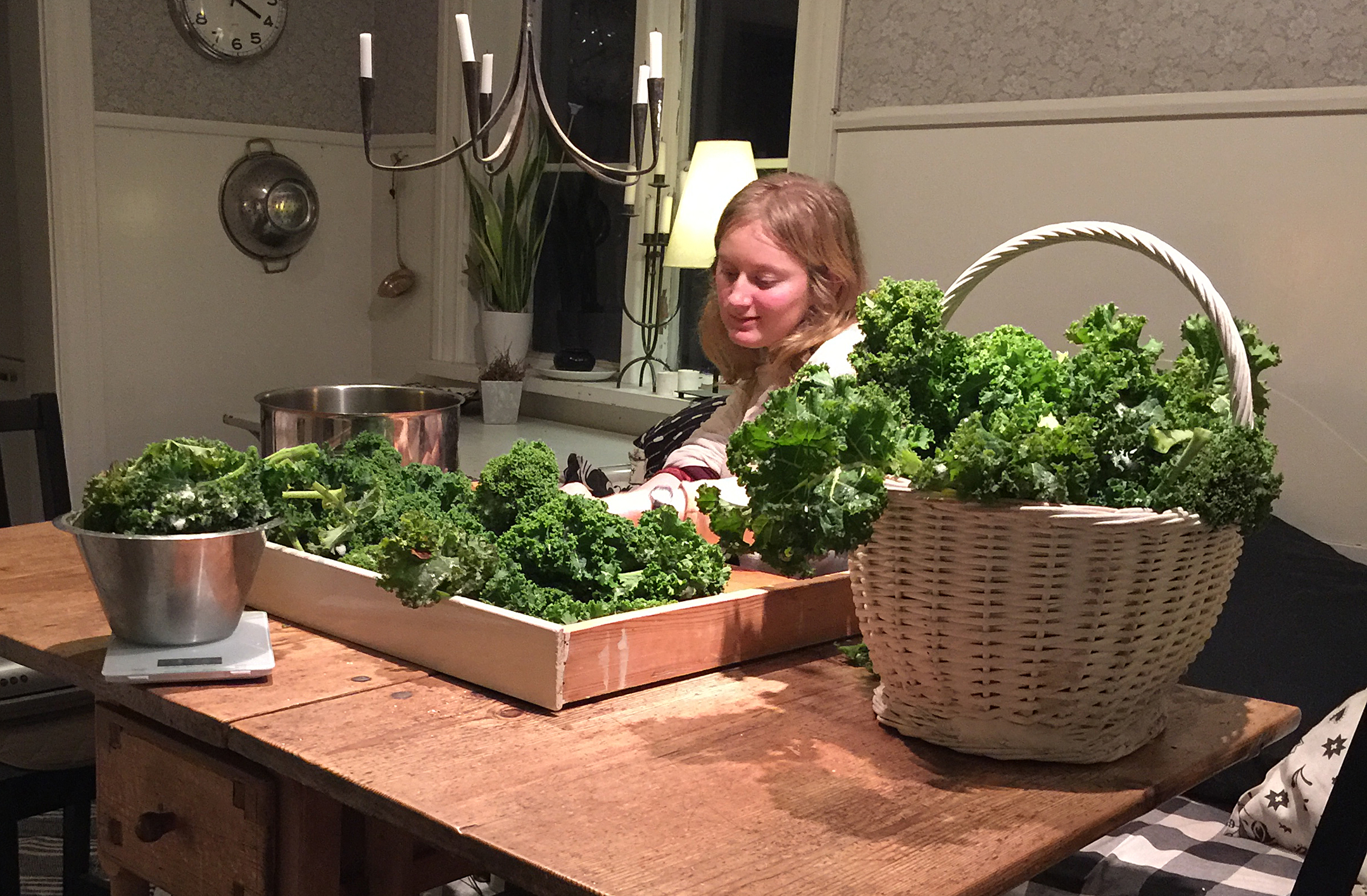 Nyskördad grönkål till sopplunchen i kaffestugan under adventshelgen. Naturen blir ännu mer fascinerande när man odlar och skördar sina egna grönsaker. Vem kunde annars tro att grönsakslandet för vissa godsaker fungerar lika bra som odlingsbädd under växtsäsongen och nu som vinterförvaring. När man väl lokaliserat och lyckats gräva fram grönkålen under snödrivorna så är den lika fräsch nu som när den var färdig för skörd i augusti.
