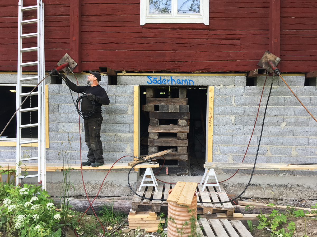 Projekt ”Rädda storstugan” åkte upp på prioriteringslistan. Till vår lycka hittade vi Mats Jakobsson som driver Tunga Lyft och Flytt i Bergvik som trodde på våra tankar att lyfta upp huset för att mura en ny källare därunder, och som dessutom hade kompetensen och utrustningen för att genomföra det. Mats är en mycket ”tungt” anlitad hantverkare men antog uppdraget, mer eller mindre som ett ”kuriosaprojekt”. Stadgaproblemet med uppdelning i de tre timmersektionerna klurade han sig snabbt förbi och snart stod huset i ”luften”. Vi rev resterna av källaren, men upptäckte att sockeln som den var gjuten på lutade alldeles förskräckligt och gjutningen av en utjämning fick projekteras in. Andra projekt, tidsbrist och hotande frostnätter satte sen nytt stopp för projektet med ny källarmur över vintern.