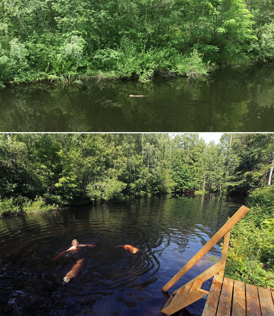 En dag för cirka ett år sedan simmade Candy omkring ovanligt länge nere i dammen, och när vi undersökte saken närmare så upptäckte vi att där också fanns en bäver som verkade skoja med henne och lekte titt-ut – dök när Candy kom nära, bara för att dyka upp igen något tiotal m längre bort och plaska för att säga ”ho, ho här är jag nu” – om och om igen. Vi hade vid den tiden just planterat 20 nya björkar i allén och såg nu framför oss hur 20 andra skulle försvinna runt dammen. Hur roligt den än verkade ha så såg vi den inte igen och tänkte att den nog insett att den inte skulle gilla att leka titt-ut hela dagarna om den skulle flytta hit. I mitten av juni var det dock dags igen… en bäver simmar omkring i Ranbodammen, uppenbarligen på rekognosceringstur, då vi några dagar senare märkte att vattennivån höjts betydligt genom en liten fördämning av grenar, kvistar, löv och lera som plötsligt byggts vid utloppet av bäcken, som går genom dammen. Gissa om vi trädkramare fick fart – lyckligtvis sammanföll det här med det vackra och varma vädret så utan att klaga så utökades antalet bad i dammen till både lunchdopp, kvällsdopp och dopp däremellan – allt för att återigen visa att just den här dammen redan var upptagen. Vi mindes med fasa de ”motorvägar” av nedfallna träd vi sett från tidigare kanotturer och historier om en 850 m lång dammbyggnad i Kanada. Med tanke på att en vuxen bäver kan gnaga av ett träd med 50 cm diameter på en dag bara för att komma åt det tunna grenverket högst upp i kronan så inser man snabbt att de vackra björkar som nu omgärdar Ranbodammen skulle kunna vara borta på ett par veckor. Så kanske ska vi nu, under kommande caféhelg, inte bara erbjuda kaffe med dopp, utan även damm med dopp.