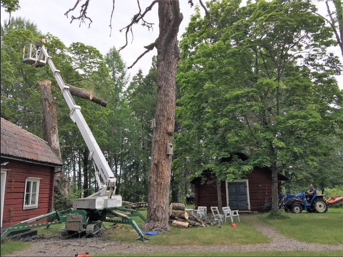 Månghundraåriga träd och månghundraåriga hus tätt inpå varandra är vackert… och den kombinationen är vanlig på Ranbogården. Det är dock dåligt för nattsömnen när höststormarna kommer. Börjar träden dessutom dö och tappa stora grenar är det dags att rädda husen. Lugn… vi ska inte ta ner alla, men de två mest hotfulla måste åtgärdas. Med hälften av trädgrenarna lutandes in långt över husen är det svårt att fälla ifrån roten och då kommer en skylift väl till pass. Med grenarna ur vägen kan Samuel sedan såga ner stammen i lagom stora bitar och Richard ser med traktor och vajer till att de verkligen faller som Samuel förberett. På marken gör de sig mycket bättre – blir till en konstinstallation – träskulpturer av en uråldrig drakfamilj. Välkommen till helgens cafédagar och beskåda skulpturerna innan de blir kaffeved. Öppet mellan 12-16.