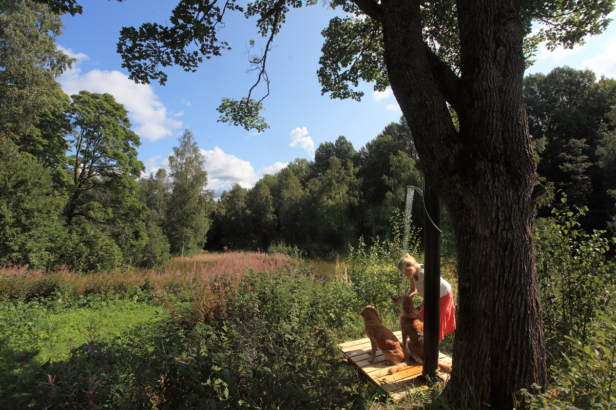 Dels så är det en mycket stark, sinnlig frihetskänsla att stå mitt i naturen och duscha, och dels så möjliggör den ju att ännu mer tid kan förläggas till härliga utomhusvistelser. En av lantlivets största fördelar är ju just de goda förutsättningarna för långa utomhusdagar och har man sen tillbringat delar av dessa med att riva en källare eller grävandes i jorden så är det lämpligt att kunna skölja av sig merparten av smuts och svett utomhus… gäller i ännu högre grad för de fyrfota grävarna. Det minskar ju nämligen också nedsmutsningen inomhus vilket indirekt ger ännu mer tid för roliga utomhussysslor.