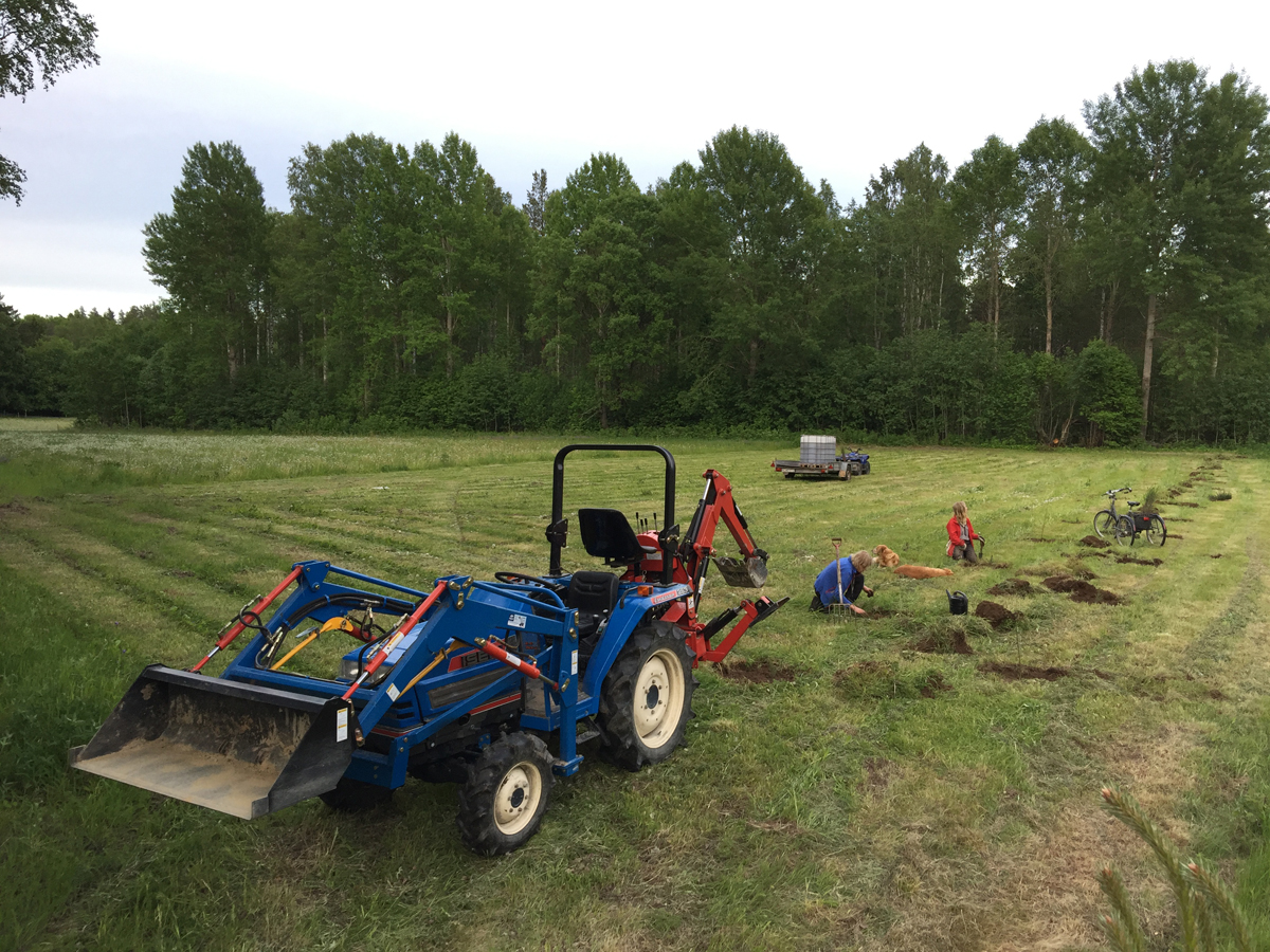En ny Ranboskog planteras – i alla fall en liten skogsdunge – och ”snart” fungerar förhoppningsvis de 130 björk- och granplantorna som ett extra ”fårstängsel” mot väg 50. Med dessa nya kolsänkor klimatkompenserar vi ju också lite för de extra resor, och fossildrivna vänner, som ett lantliv ofta medför.