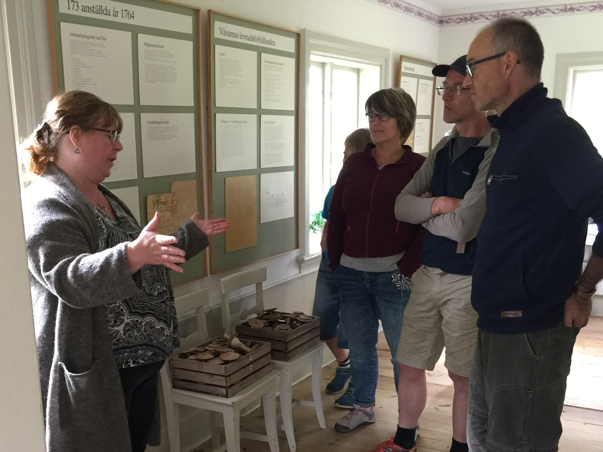 Annika Windahl Pontén, vår Uppsalavän och expert på bland annat 1700-talets textilier, fyller några av våra kunskapsluckor kring linet och dess användning. Den ”snabba” rundturen i stugan Mamsells på gården i väntan på kaffet blev istället en timmes intressant rundtur med anekdoter och kuriosa… inte konstigt att Annika fick ansvara för Uppsala universitets deltagande i Linné-jubiléet 2007 för att fira hans födelse 300 år tidigare. Bland annat fick vi under rundturen veta hur svårt linet är att färga och varför det av den anledningen, när det gäller klädedräkt, främst användes till de undre lagren. Flor hade egen Hallrätt 1753-1793. Detta var en slags domstol som fanns i städerna och skulle bl.a. hantera eventuella bråk hos manufakturerna men även tillverkningsförhållanden och varukvalitet. De kunde tilldela tillverkarna egen hallstämpel. Annika blev dock överraskad över att den funna Hallrätts-stämpeln från den tiden demonstreras som lackstämpel på vår skärmutställning om Flors lin, eftersom hon i sin forskning studerat ett plagg som är stämplat med något som sagts vara en hallstämpel. Att se hallstämpeln på ett lacksigill stöder då Annikas misstanke om att det rör sig om en annan slags stämpel på det plagg Annika studerat. Kul att Annika fick lite ny intressant information till sin egen forskning… för inte kan det väl smugit sig in en missuppfattning kring stämpelns användning på skärmutställningen hos oss? Ni och vi får nog försöka hjälpa henne reda ut denna fråga.