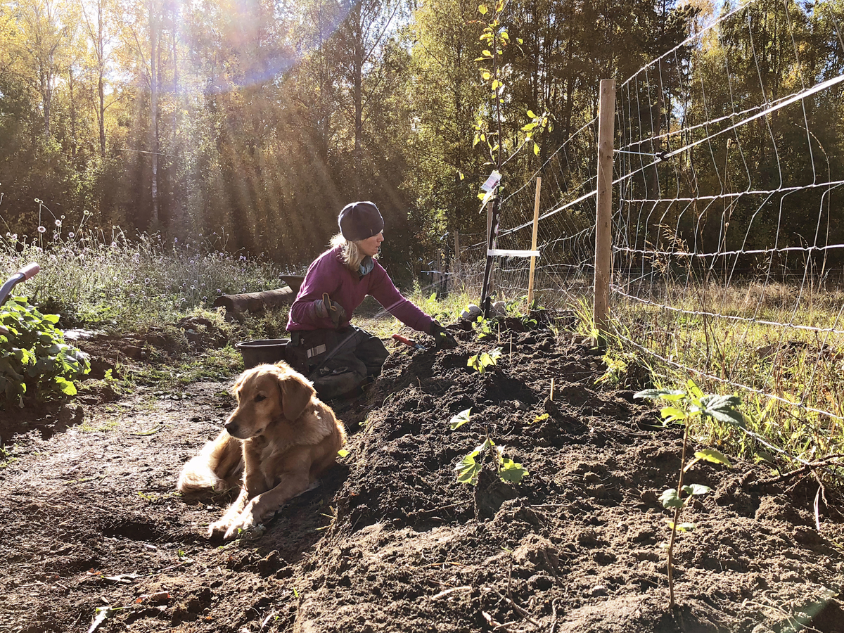 På Ranbo har vi hörsammat råden och den här dagen fick 50 av alla fjolårets sticklingar från olika bärbuskar äntligen en permanent hemvist. Efter ett år i kruka är de fortfarande till synes tämligen små och taniga ovan jord men har relativt sett ett välutvecklat rotsystem som vi nu med höstplanteringen hoppas ska få en extra skjuts innan vinterstormarna sätter in. Förhoppningen är att de till våren – även om var och en fortfarande är liten – tillsammans ska bilda en ”mur” mot köksträdgården och mot kommande vårvindar friska.