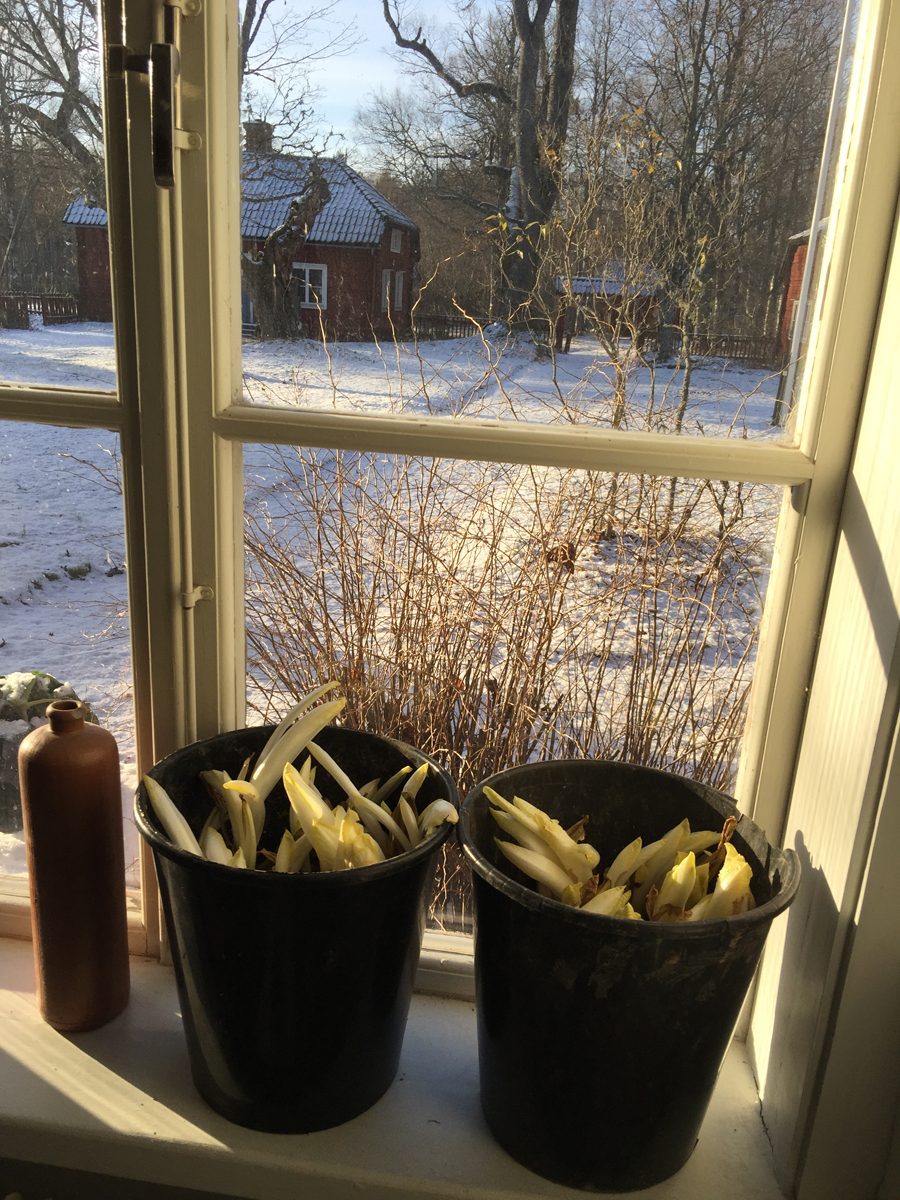 Drivcikoriornas första glimt av dagsljus får idag, dagen efter vintersolståndet, symbolisera övergången från årets mörkaste dag till den ljusare tid som vi nu går mot. För flera veckor sedan ställde vi med viss skepsis in hinkar, proppfulla med plantor bestående av endast rötter och kala stjälkar, i en sval och mörk garderob för att – utan någon som helst fotosyntes – se om späda skott av drivcikorian skulle börja utvecklas. Enligt fröhandlaren kunde vi förvänta oss små mjälla delikatesser, långtifrån sensommarens enorma men bittra bladverk. Med facit i hand så räckte uppenbarligen sommarens intensiva solljus till för att tillräckligt med energi skulle lagras i rötterna och, i garderobens mörker, ge växtkraft till skotten. Och ja, de späda och bleka bladverket förhöjde onekligen middagens äggstanning. Nästa gång vi slentrianmässigt beklagar oss över vinterns få ljustimmar ska vi påminna oss om de tappra små skottens mörka leverne – i jämförelse med de minuter dagsljus som de fick den här vintern – så har vi badat i dagsljus… allt är relativt.