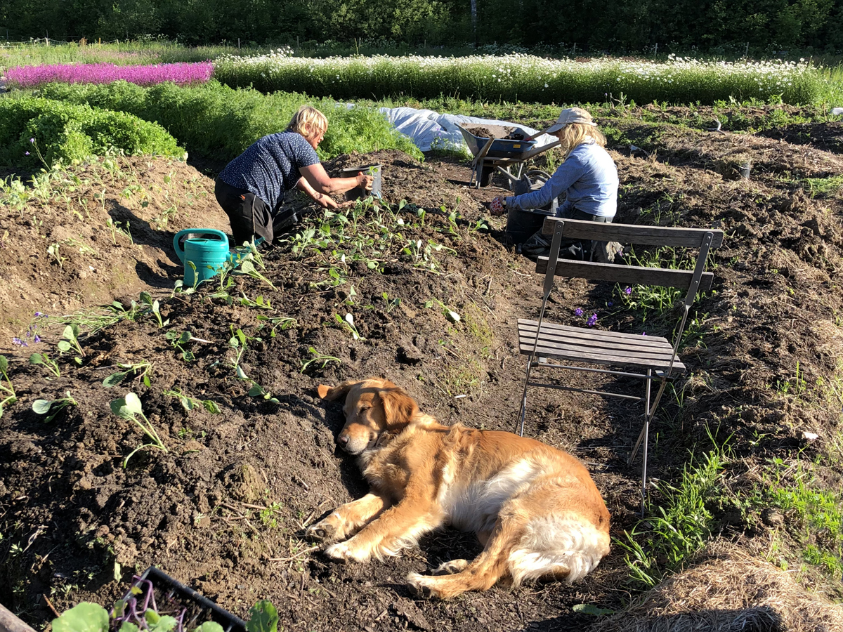 Glada och tacksamma över att äntligen få tid att pyssla om och bädda ner de tusentals små kålplantorna, som sedan april stått på tillväxt och tålmodigt väntat på friheten i friland. Friland är ett odlarbegrepp för utomhusodling som denna dag ”andas” så rätt inte bara för plantorna utan lika mycket för oss… till att börja med, vill säga.