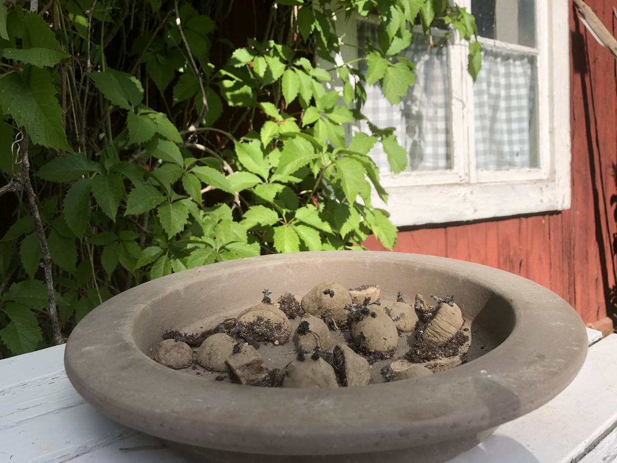 Den som upplever sig ha för lite sättpotatis eller den som bara tycker om att experimentera kan dela sina sättpotatisar i ett antal bitar och … vips – inom några veckor har de olika potatisbitarna fått groddar. Nu återstår att se om dessa groddade sättpotatisbitar, när de hamnat i jorden, genererar lika många potatisar som en odelad potatis, eller om de levererar i proportion till sin delning? Om det förra gäller, till vilken nivå kan man då ta det och är den ökade arbetsinsatsen värd det? Det har säkert experimenterats med detta förr och svaren är säkert bara en googling bort, men ofta är egen erfarenhet roligare och kunskap som fastnar bättre.