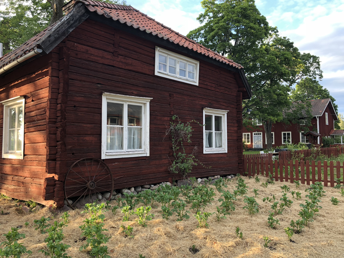 På 1970-talet var det populärt att odla potatis i villaförorterna som markberedning till gräsmattorna. Idag finns det många som förbereder frukt- och bärodlingsytor på samma sätt genom att plantera potatis som ska luckra jorden och hålla rotogräs borta. Inspirerade av detta så tänkte vi att man kanske kan bredda användningsområdet ytterligare. Så i våras satte vi igång ett projekt för att se om potatisodling även kunde hjälpa till att få ordning på ytorna runt Kaffestugan där i och för sig vackra men ack så invasiva lupiner hade fått fäste. Förhoppningen var att denna form av markberedning även skulle kunna ge de svårstoppade lupinerna en match och därmed istället ge bra förutsättningar för en större mångfald av blommor och fleråriga grönsaker. Så lupinrötter grävdes bort och marken täcktes med papp och hösilage. Några hål gjordes med spett där groddade potatisar lades ner och sen lämnades allt åt sitt öde. Ingen bevattning eller annan hjälp ifrån oss bidrog till att överraskningen blev extra stor när, plötsligt, potatisblast börjar titta upp lite överallt… medan lupinerna lyser med sin frånvaro. Så i år blir det alltså en rabatt i 1600–talets slotts- och herrgårds-stil – där potatis, genom Olof Rudbeck d.ä. försorg, ofta odlades som prydnadsväxt för sina vackra purpurfärgade blommors skull. (Ni kommer väl ihåg att det var ju först på 1740-talet som Jonas Alströmer och Eva Ekeblad populariserade potatisen för mat och brännvin). För även om vi idag vet att potatisväxtens verkliga värde finns under jord och att det därmed är frestande att gräva upp pärerna så vill vi ju inte röra runt i den marktäckande pappen och riskera att väcka de lupinfrön och rötter som förhoppningsvis är på väg att somna in för gott.