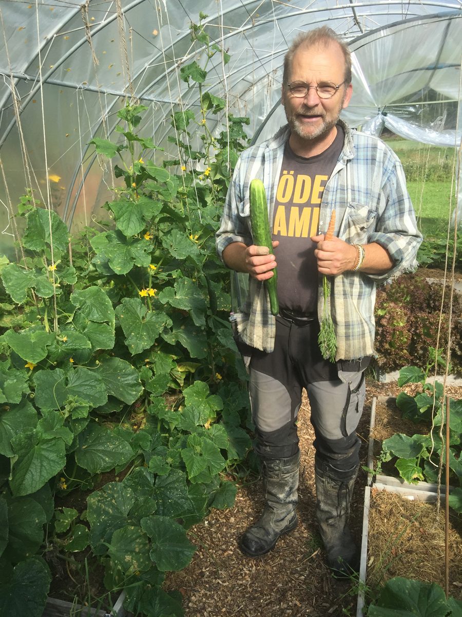 Under det kommande året får vi ynnesten att, med Anders Persson som kursledare, lära oss mer om ekologisk odling i småbruk. Kursen ges av Hälsinglands utbildningsförbund och har planerats i samverkan med bland annat Sveriges Lantbruksuniversitet. Fokus kommer vara på planering av större odlingar, förvaring och förädling. Även en del omvärldskunskap ingår där vi utifrån ett bredare perspektiv studerar hur social-ekologisk och teknologisk resiliens kan byggas upp i lokalsamhällen. Vi har också en egen liten förhoppning att, under kursen, få lära oss måla en Lilla Fridolf, kanske med en lika förbluffad min som vi själva hade då vi i växthuset fick ta emot den stora nyskördade gurkan. Japp vår kursledare har många strängar på sin lyra, bl.a. har han varit tecknare till Lilla Fridolf, 91:an Karlsson m.m. Lika häpna som vi blev över den välvuxna gurkan blev vi också över nyheten att den lilla moroten i Anders andra hand är hårdvaluta i restaurangbranschen – en av höstens heta trender i Stockholm… är det månne en smart lobbyinsats från Anders och andra jordbrukare som, pga av den kalla sommaren, har precis just bara små morötter att erbjuda. Den som vill vara med och överraskas av fler fantastiska grönsaker är välkommen till söndagens skördemarknad på Tjärnvik gård i Vågbro (vid Skärsåvägen, kl 11-15, den 24 sept)