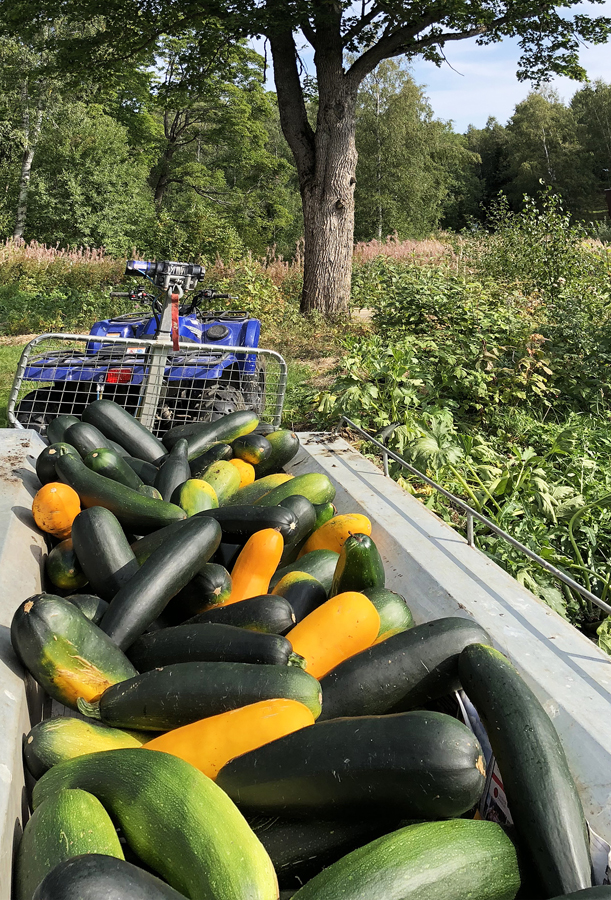 Denna dag gjorde vi äntligen slag i saken… för att ganska snart erfara hur fullkomligt onödigt detta stresspåslag varit. Fyra-kilos-exemplaren av sommarsquashen var genomgående lika goda som småttingarna och konsistensen på fruktköttet var lika fin som under högsommaren. Det positiva med den påskyndade skördeinsatsen var emellertid att vi snabbt lärde oss hur man effektivt får ner många kilo squash till några kilo lagringsbara förädlade produkter.