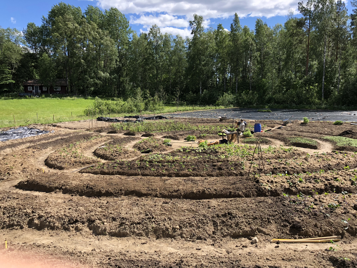 Javisst… ur det märkliga grävprojektet har, som de flesta säkert gissat, grunden till en köksträdgård vuxit fram! Målet var att hitta en vacker och praktisk design baserad på olika odlingstekniker som kan underlätta för Julias framkomlighet och odlingsinsatser. Så då lät vi oss inspireras av spindelns spiralmönster i sitt nät, i kombination med astronomen Tycho Brahes symboltunga renässansträdgård. Resultatet blev en köksträdgård som innebär korta transportsträckor, både vid varje växtföljds odlingslimpa och mellan de åtta olika växtföljderna. Där bidrar de fyra lite större transportvägarna in till ”centrum” till god framkomlighet för Julias trehjuliga cykel och en fyrhjuling med släp … vilket innebär korta gångsträckor för Julia och för oss andra när vi ska transportera material till och från odlingsbäddarna. Genom att låta odlingsbäddarna ”växa sig höga” och ”permanentas”, dvs inte harvas eller grävas om varje säsong, så hoppas vi att förutsättningarna för god tillväxt av både mikroorganismer och plantor ökar och att intensivodling med korta plantavstånd kan tillämpas – plantorna går på djupet istället. Nu – när det är slutgrävt – hoppas vi att bakterier och svamphyfer ska göra sig hemmastadda och trivas lika bra som vi människor redan börjat göra– i det senare fallet har nog designvalet bidragit – viss forskning visar nämligen att runda mjuka former ökar människans välbefinnande och trivsel. Vissa menar kanske att något väsentligt saknas för att projektet ska kunna fullbordas… ett ”Tycho Brahe-observatorium”. Att liksom denne store astronom, från köksträdgårdens centrum, sitta och skåda ut i världsalltet skulle förstås vara ”pricken över i:et”. Och givetvis har Ranbogårdens f.d. rymdfysiker tagit med detta i beräkningen när det lämnades ett utrymme i centrum. Med moderna stjärnkikare behövs ju bara en bråkdel av ytan jämfört med det Tycho krävde för sina ”himlastudier”… faktum är att sen vi flyttade till Ranbo så räcker det med att ibland, sitta ner på en bänk och med blotta ögat njuta av vår och Mo´s vackra placering i världsalltet. Både i spindelvärlden och hos de äkta trädgårdsmästarna ger man tummen upp för denna bort-prioritering – det ger mer utrymme för mat att sen sitta och kalasa på under mer eller mindre filosofiska pausar i ”nätets” centrum.
