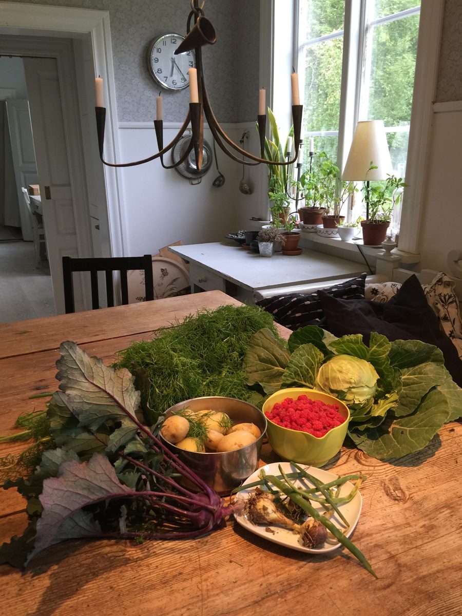 Glädjen kan knappast bli större – vårt livs första grönsaksskörd! Rejält förvånade över att det faktiskt ”funkat” – våra ogröna fingrar till trots. Måste vara väldigt tålmodiga och förlåtande små frön. Alltid lika fascinerande att reflektera över hur det lilla fröet mha av mestadels väte, syre, kol och kväve (och solljus förstås) på bara några veckor kunnat resultera i denna enormt varierade växtmassa med sina lika enorma smakvariationer. Nu har vi fått blodad tand och ser fram emot kommande veckors – eller snarare månaders – eller t.o.m halvårs grönsaksskördande… grönkålen, svartrötterna, jordärtskockorna och palsternackorna kan tydligen skördas ända fram tills tjälen släpper framåt vårvintern förutsatt att vi lyckas gräva fram dem ur snömassorna vill säga… och dessutom innan sorkarna gör det. Nu återstår att ta reda på vilka rätter som dessa vitamin- och mineralbomber kan ligga till grund för. Fler delar av plantorna kan förtäras än vad vi vanligtvis först tänker på. T.ex. så åkte den uppsvällda delen av kålrabbistjälken ner i kvällens skördesoppa tillsammans med ett nedklipp av dess vackra bladverk – de enda som var besvikna denna kväll blev kanske våra vänner i hönsgården som härmed snuvades på sitt ”blad-kvällsfika”.