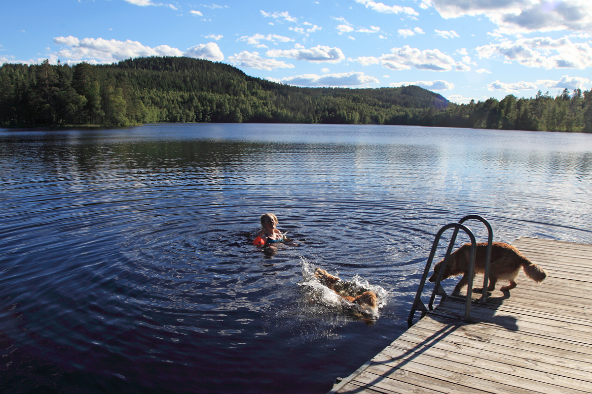 Alpkänsla i Hälsingland – orienteringsstugan vid Björktjärn. Med en sådan placering av klubblokal borde det vara lätt att rekrytera nya medlemmar. Kvällsdopp efter en lång dag av förberedelser inför första caféhelgen – passar på att tvätta av oss allt socker och mjöl från flera timmars bakning.