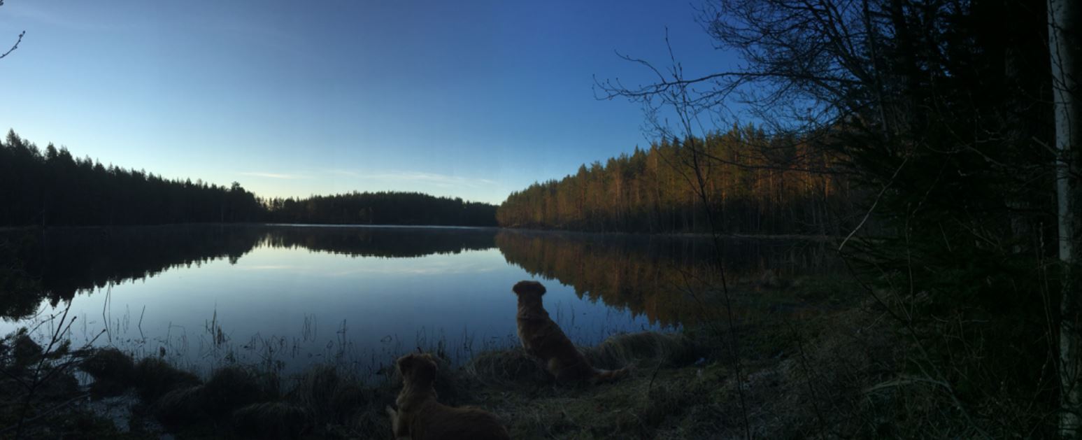 Stilla morgon vid Acktjärn. Med 9000 ha viltvårdsområde bakom gården är det lätt att hitta varierande och vackra springrundor. Inte konstigt att O-Ringen (5-dagars orientering) vid tre tillfällen arrangerats i dessa stora, vilda och fantastiska skogar.
