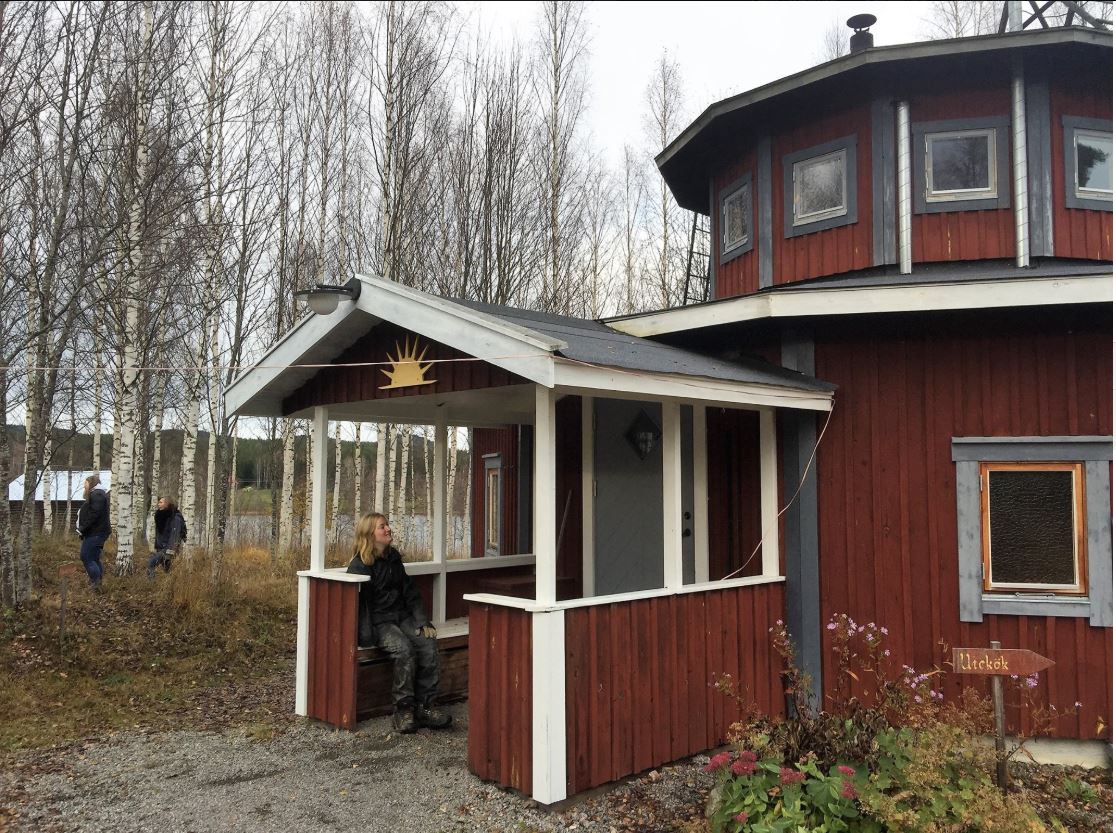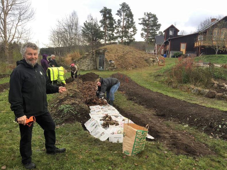 Ralf Palmpers på Växhuset – ekobyn utanför Söderhamn – visar oss kursdeltagare på Småbrukarkursen hur han gör effektiva kompostlimpor. Nyligen skördade Ralf, på en av odlingslimporna, drygt 100 kg (!) morötter. På den nyuppförda odlingslimpan kommer han nu, redan under hösten, plantera gul lök, och en bit bort prova på att så fröer av morötter, palsternackor och andra rotsaksfröer. På så vis hoppas han få en tidig start med härdiga växter under en extra lång växtsäsong nästa år. Växhuset erbjuder många möjligheter att se hur dessa och andra innovativa odlings- och energilösningar tillämpas. Kurser, café samt övernattningsmöjligheter är endast några av alla de aktiviteter som Ralf och hans kollegor ordnar. Det tolvkantiga vandrarhemmet är en upplevelse i sig självt – varpå 85 m2 inryms 18 bäddar i ett antal rum centrerade runt något som bäst kan beskrivas som en gemytlig ”ljuskyrka” där den vedeldade kaminen tillför extra värme och trivsel. Här bor man i en rakt igenom ekologisk miljö; exempelvis används lin som isoleringsmaterial, solceller står för elproduktionen och gråvattnet leds till ett system av dammar för naturlig rening.