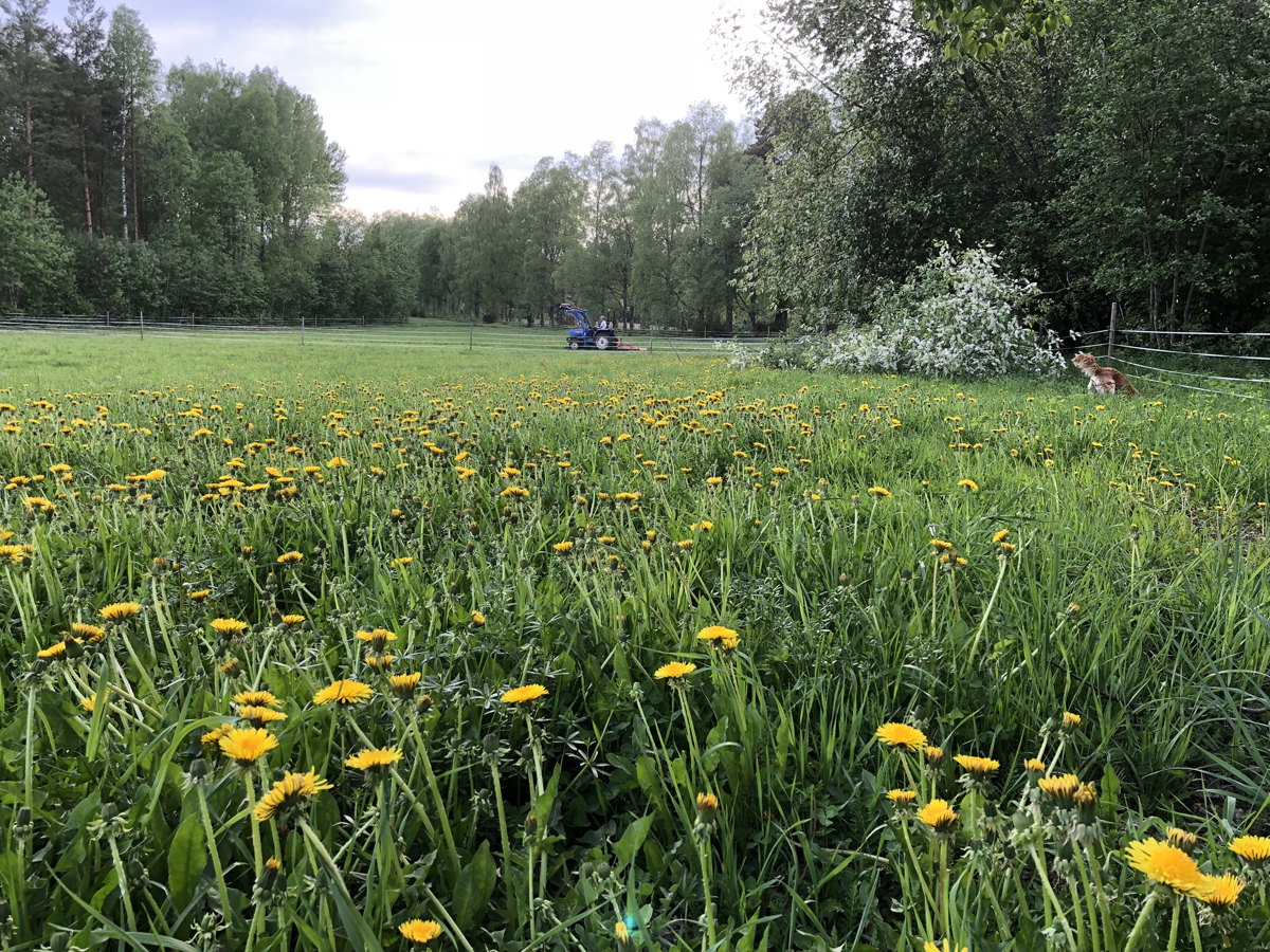 Som små solar lyser de upp stora fält – maskrosorna – denna seglivade kämpe som tar sig genom de tuffaste markförhållandena. Förutom att själv vara en överlevare så betraktas den som en av de 14 viktigaste vildväxterna för oss människor i en överlevnadssituation.; den kolhydratrika roten kan ätas kokt eller – rostas som kaffesurrogat-, de C-vitaminrika späda bladen kan ätas färska och om du vill lyxa till det lite så prova att fritera knopparna eller göra maskrosvin av blommorna … eller varför inte lite maskrossirap. Vetskapen om att maskrosor även förser bin med högsta klassens pollen och nektar bidrar också till beundran för denna lilla tuffing. Men… vetskapen om dess enorma spridningsförmåga genom rotskott och genom sina bollar av flygfrukter bidrar också till stor bävan och ängslan över att ha detta fält av erövrare som granne till köksträdgården. Det blir sannerligen en utmaning för de små grönsaksplantorna att överleva i konkurrensen ifall vi inte agerar. Den här kvällens pass med betesputsen är nog bara ett i en lång rad. Visst – vackra, vitala och viktiga – but not in my backyard … känns det igen?!