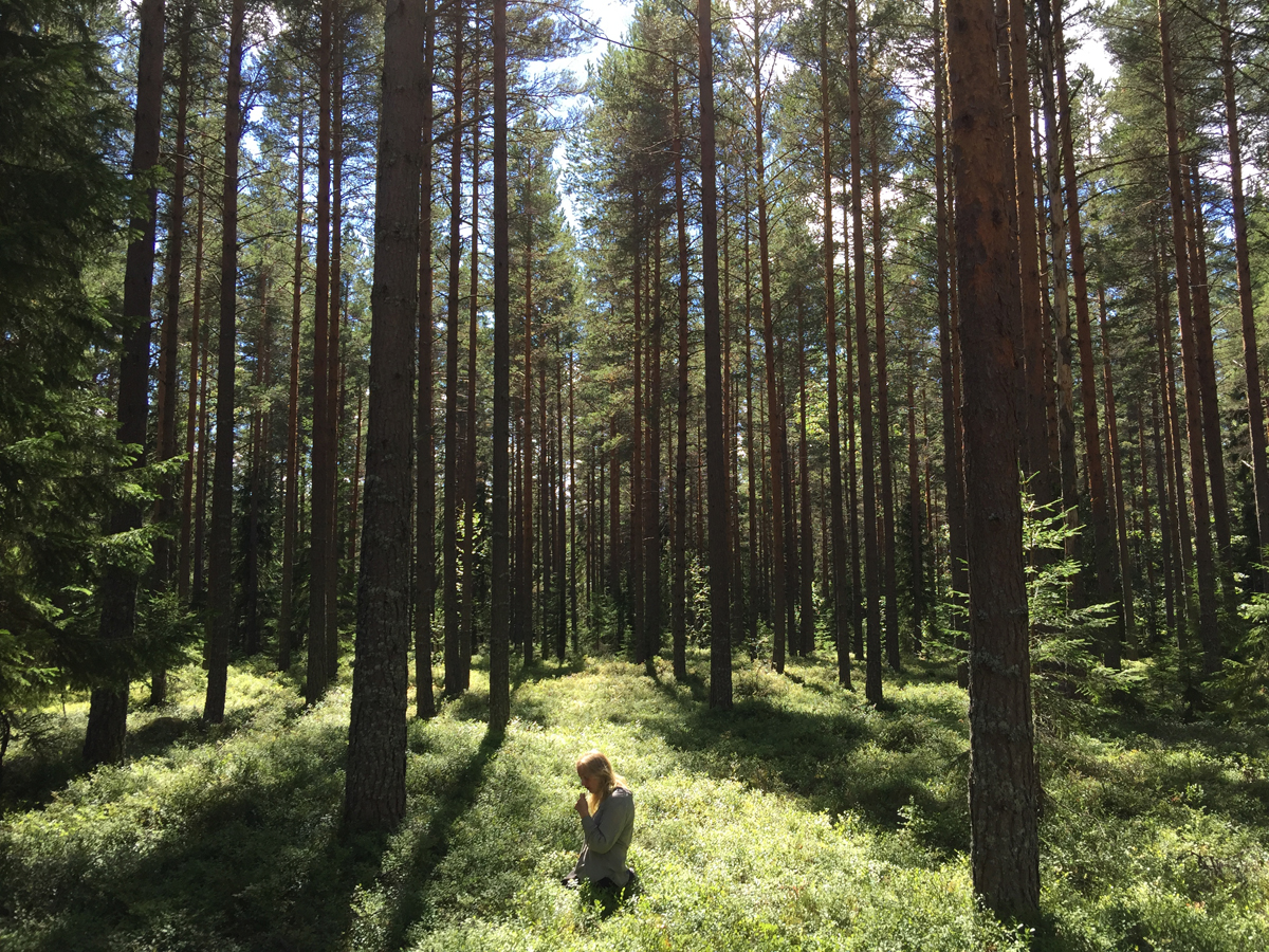 Vackert och andäktigt med solen som strilar ner genom grenverket… som i en skogens katedral. Konstigt nog så är det lika tyst också – vanligtvis brukar blåbärsplockningen kombineras med ett insektssurrande och ett visst fäktande mot angripare men den här sommaren letar vi blåbär i kortärmade skjortor och myggmedlet hemma. Det är nästan kusligt tyst ute i blåbärsskogen – Förklaringen beror nog till stor del på de sena frostnätterna som gick hårt åt blåbärsblommorna. Med tanke på att 17% av Sveriges yta täcks av blåbärsris så förstår man att frånvaron av deras blommor och därmed deras nektar, som är en viktig bas för humlor, fjärilar, mygg osv. också drar ner dessa populationer på rekordlåga nivåer. Och då blir det förstås dubbelt jobbigt för de fåglar som äter både blåbär och insekter. Så trots att man sitter där skönt i solgläntan med lagom svalka från träden och som här, tillräckligt med blåbär för att åtminstone fylla magen och kanske t.o.m att ta med hem för en paj så är det inte utan att man saknar de små flygande sugrörsförsedda rackarna eftersom de ackompanjerade fjolårets blåbärsrekord. Tack och lov påverkas inte mängden av blåbärsris som skrovmål för både älg och rådjur. Bäst dock att lämna lite bär till Nalle så han lämnar oss i fred på höstpromenaderna.